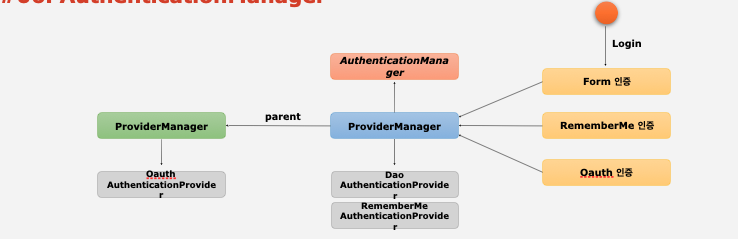 만약 ProviderManager에 해당 조건에 맞는 Provider가 없다면, 부모 ProviderManager에서 Provider를 탐색하여 찾는다면 부모 ProviderManager에게 인증을 맡긴다. (예: 위의 사진에서 Oauth 인증일 경우)